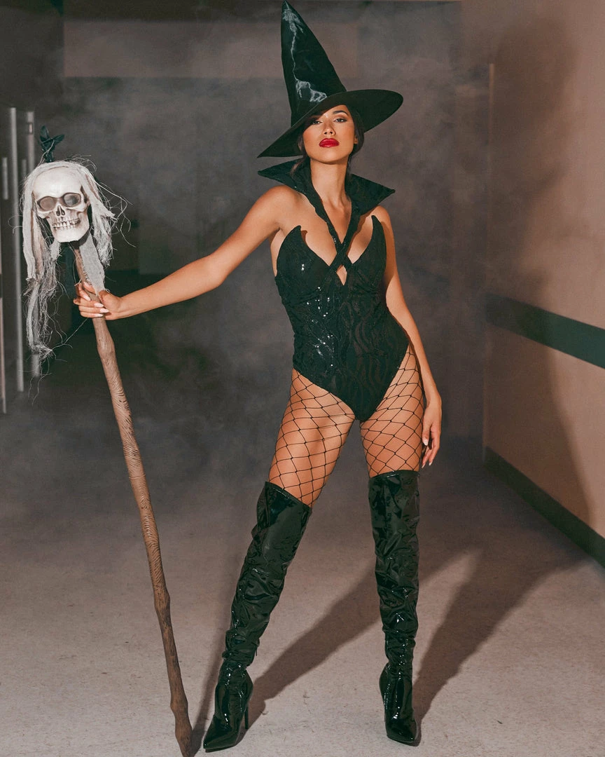 Includes Sequin Bodysuit with Detachable Collar and Witch Hat