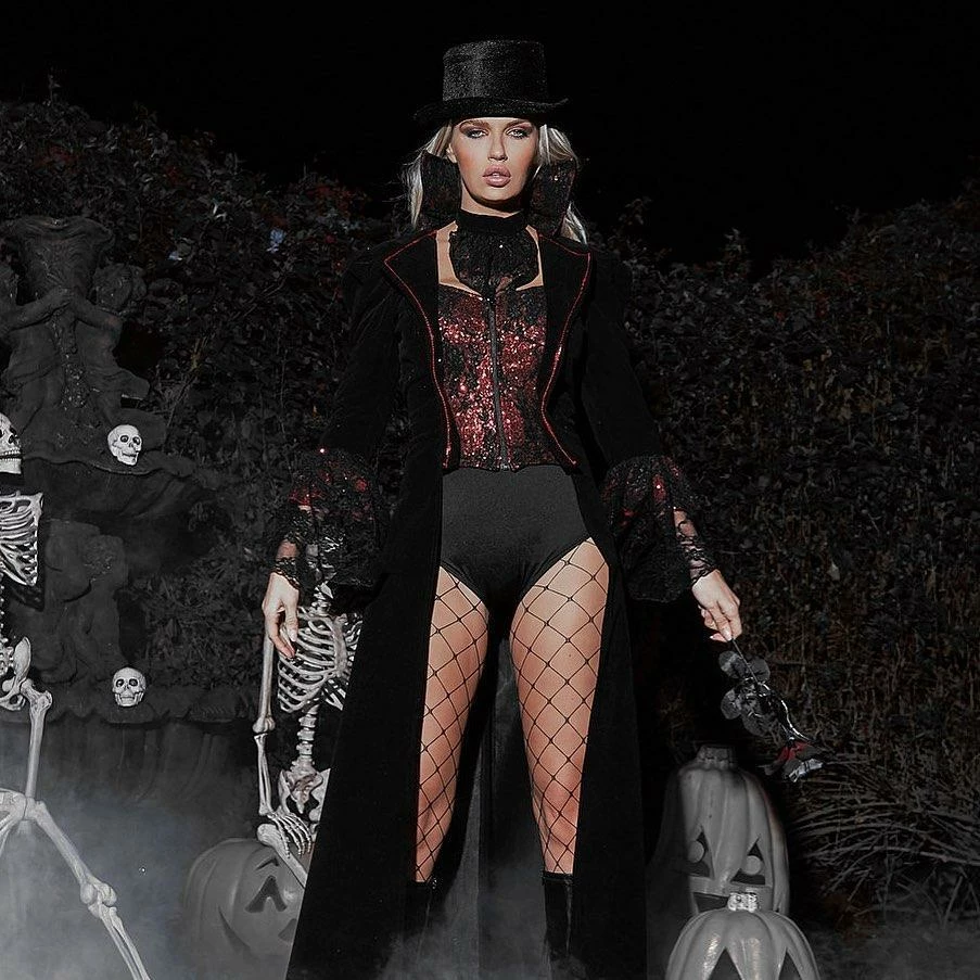 Includes Long Coat with Flair Sleeves and Trim Detail on Collar and Built in Corset with Zipper Closure, Neckpiece, Shorts, & Top Hat