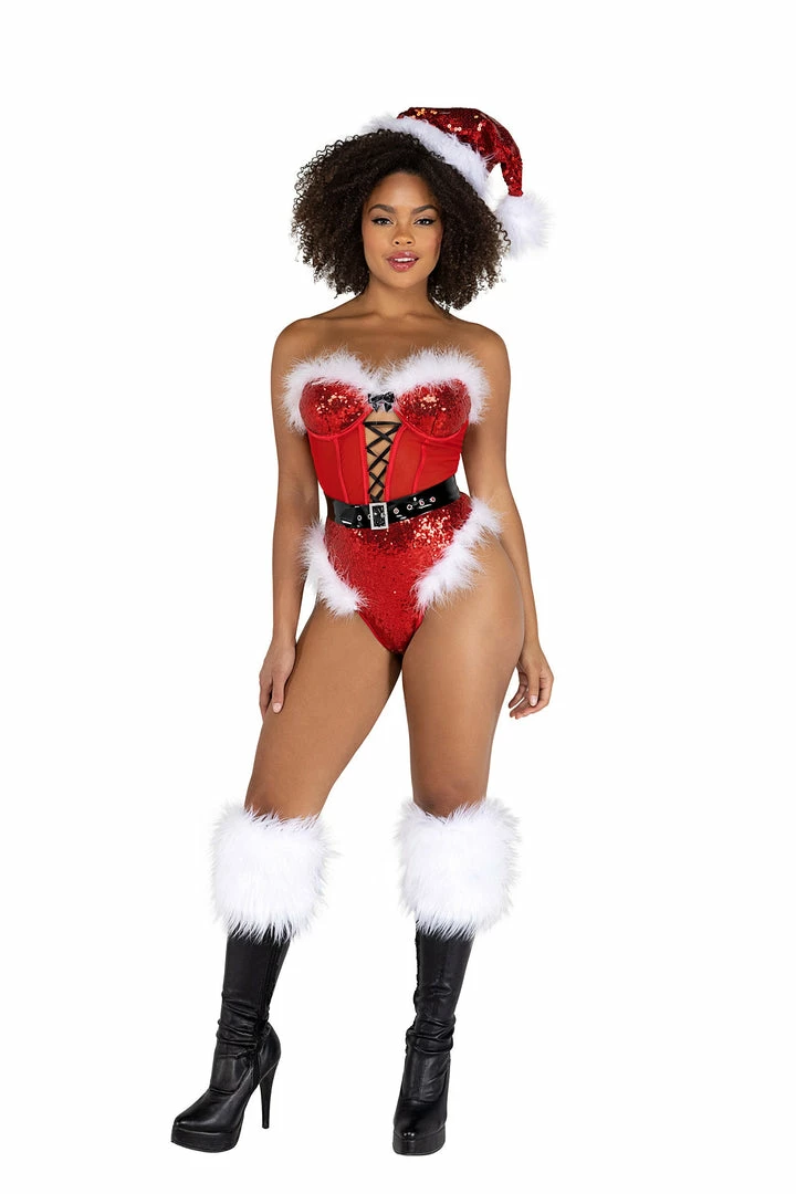 Sequin and Mesh Lace-Up Romper with Faux Fur Trim Detail andVinyl Belt with Faux Diamond Buckle